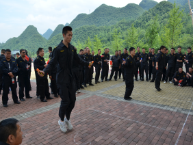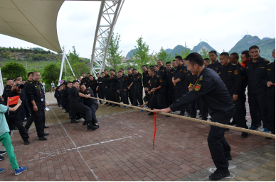 二、此次活動邀請了監(jiān)管機關及客戶單位共17家到場觀摩指導。分公司經(jīng)理黃水波向蒞臨的各級領導和來賓致歡迎詞,對他們的到來表示熱烈的歡迎和由衷感謝。室外科目為跳繩、接力賽、拔河三個項目。跳繩每隊為3名隊員,記集體總成績,各大、中隊精心挑選出各自跳繩尖子,積極為參賽人員吶喊、助威,一個個參賽的帥小伙瞬間變成了蹦蹦跳跳的“小女生”。接力賽為6乘50米,各中隊長抽選運動健將,為著各自的榮譽和不服輸勁頭在賽場上拼命沖刺。最激烈的當數(shù)拔河比賽了,各參隊每隊為10人,分為淘汰賽、半決賽和決賽,各大、中都將“大塊頭”、“大胖墩”推上賽場,隨著裁判員的一聲哨音,現(xiàn)場仿佛炸開了鍋,在旁觀加油鼓勁的人員似乎比拔河人員更賣力,邀請到的客戶單位領導也都在為各自派駐中隊參賽隊員加油,活動氛圍瞬時達到頂峰。