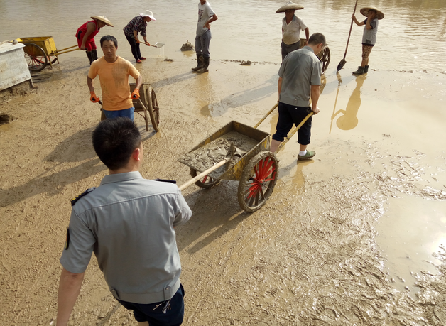 同時(shí),洪水還導(dǎo)致了沿河兩岸絕大部分的沿江步道被淹,綠化、亮化、沿線亭閣、景觀、護(hù)欄均被嚴(yán)重沖毀,河岸邊步道上留下了大量白色垃圾和淤泥。為了使災(zāi)后堆積的垃圾能夠盡快得到清理,小分隊(duì)與環(huán)衛(wèi)工人一起出動(dòng)清淤的同時(shí)還將被洪水沖毀的護(hù)欄邊的垃圾也一同清理干凈。