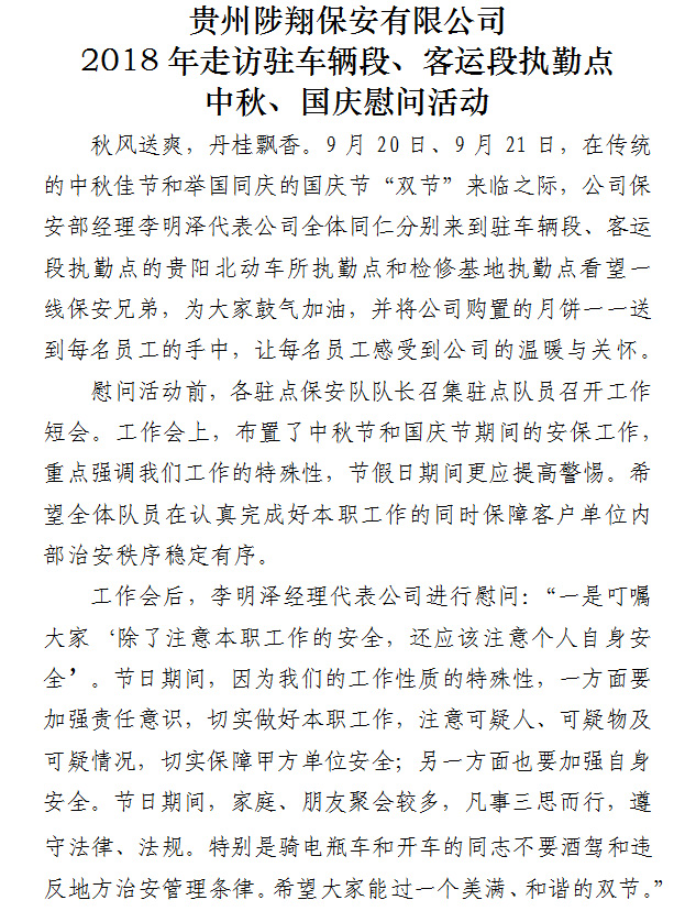 貴州陟翔保安有限公司 2018年走訪駐車輛段、客運段執(zhí)勤點 中秋、國慶慰問活動