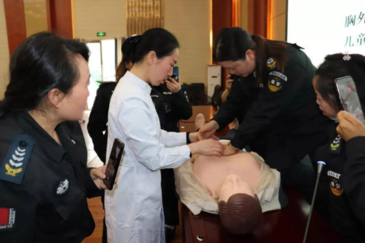 (護(hù)士長(zhǎng)胡佐順指導(dǎo)保安隊(duì)員練習(xí)心臟驟停搶救)